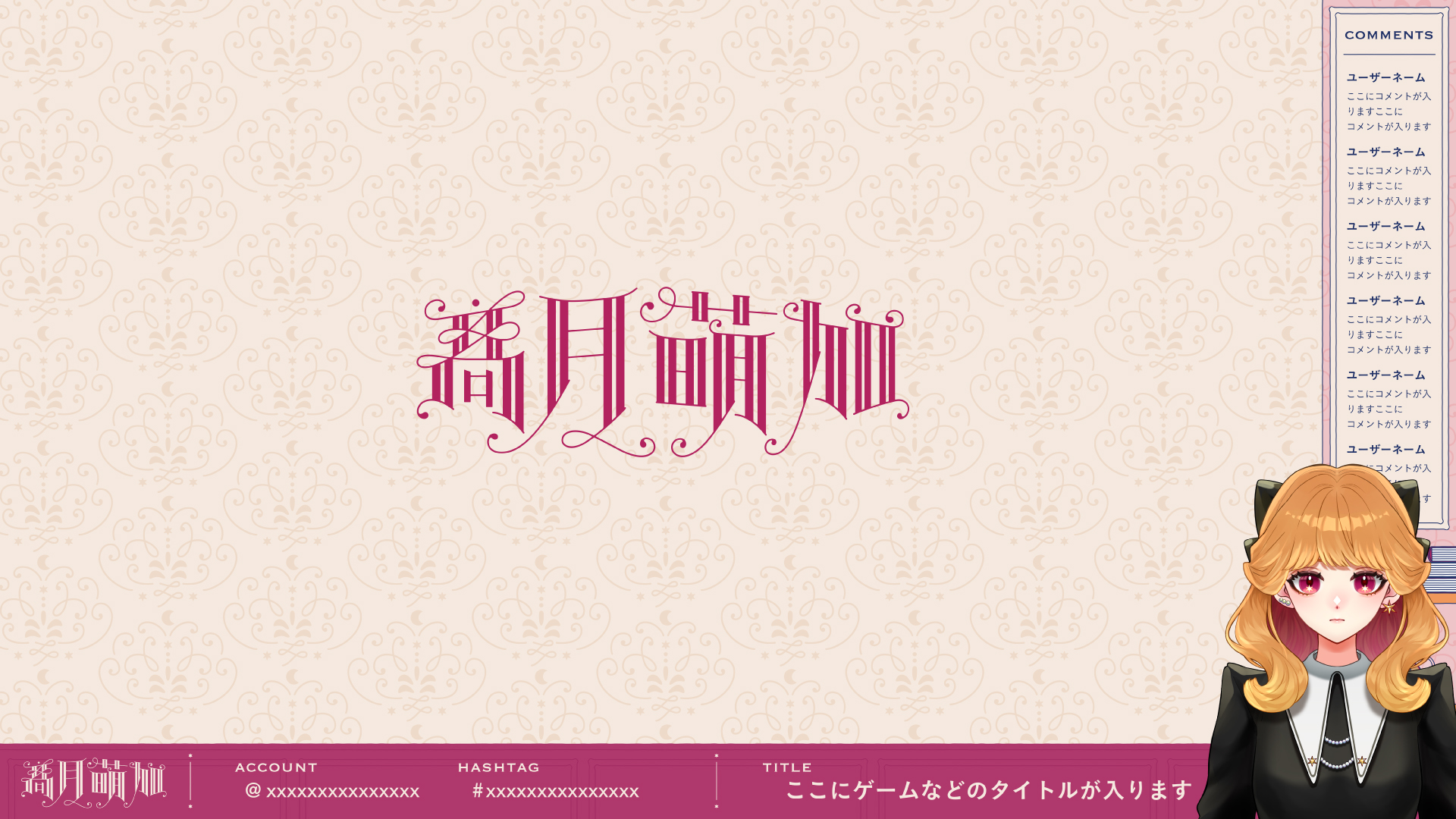配信画面は落ち着きのあるピンクやベージュを軸に、アンティーク調の家具をモチーフとしたグラフィック・イラストで構成。星空の見える窓をご希望いただいたので、部屋も少しだけ夜の薄暗くも温かいキラキラした印象にまとめました。